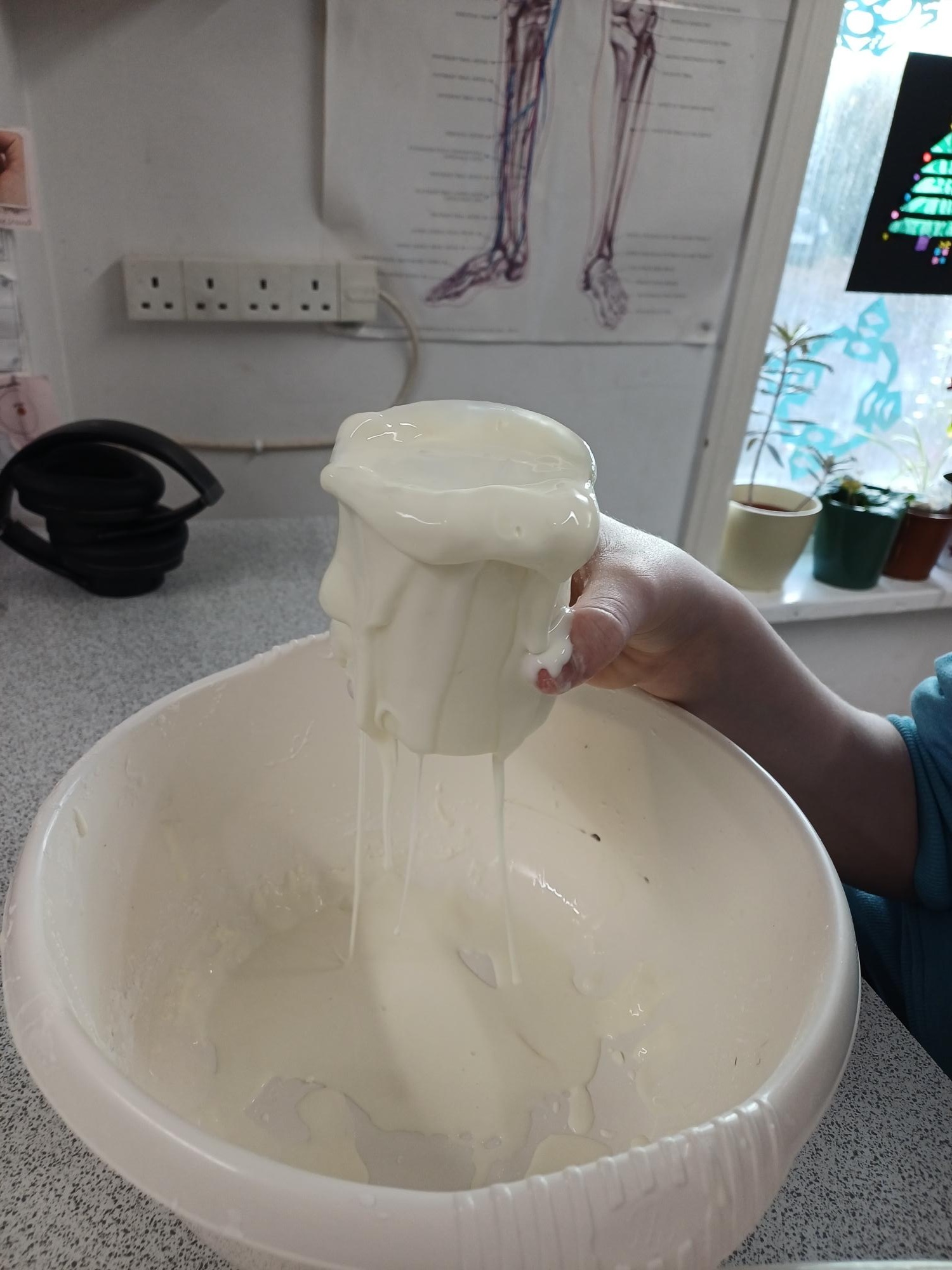 Then they made ‘ooblek’ – which apparently is a ‘non-Newtonian fluid’. In lay-man’s terms it is something that behaves like a solid when force is applied, and then reverts to liquid when left alone. Remember this when you are mixing cornflour with water for your Christmas gravy – you’re making an ‘ooblek’!