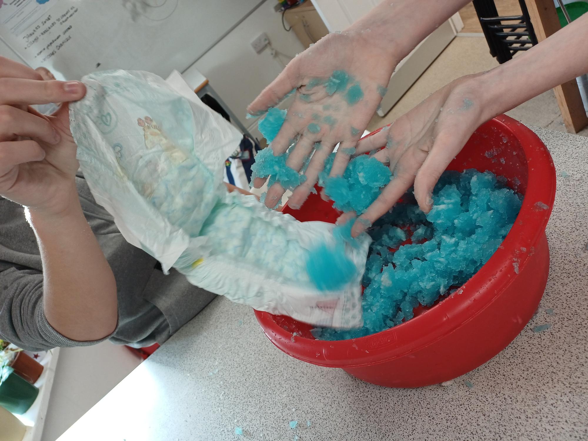 Students made fake blue snow using the crystals found in disposable nappies and mixing them with blue food colouring!